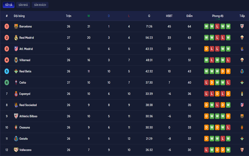 Tương tự như các giải đấu khác, kênh cũng cập nhật bảng xếp hạng La Liga một cách đầy đủ và chi tiết. Người dùng có thể nhanh chóng tra cứu vị trí của đội bóng mình yêu thích cũng như theo dõi cuộc đua vô địch của mùa giải.